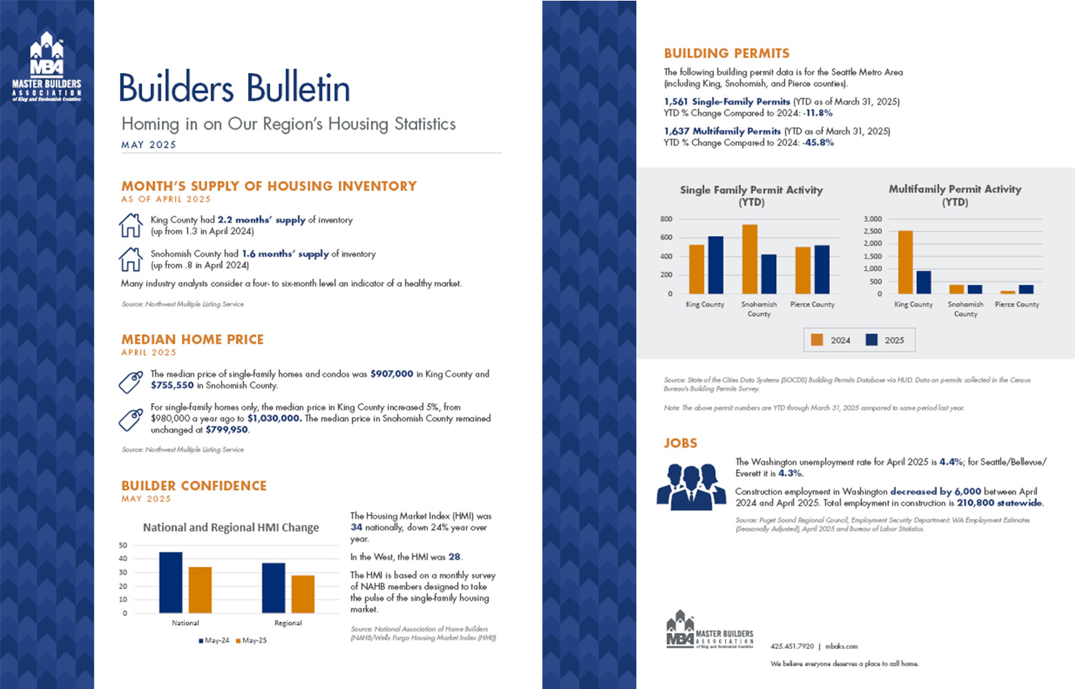 New permit data show a 33% decline in permits in the Seattle metro area in the first quarter of 2025 compared to the same period last year. While single family permits saw a modest increase in King and Pierce counties through March of this year, they fell 43% in Snohomish County. Multifamily permits were down 46% across our metro area during Q1 2025 compared to last year, with the biggest decline in King County. Pierce County was the only county to see an increase in multifamily permits during the first quarter.